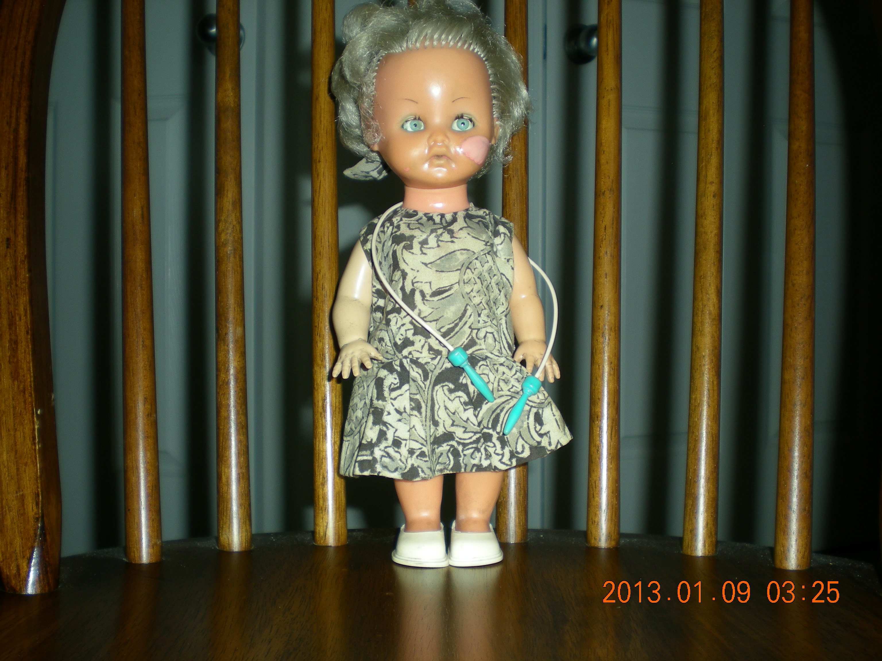 I woke up in a cold sweat, and realized with a “whew!” that I had been dreaming, and it was all I could  do to  go back to sleep and wait until a couple of hours later to rummage  about in the  Samsonite strolley to recover Gita Paapa and find her lying there  in one piece ,  still wearing her printed frock,  white shoes, and the blue&white skipping rope around her shoulder.